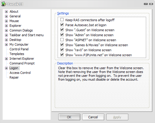 .png File Attachment: TweakUI Example - Hiding accounts from friendly logon.png (41.25 KB)