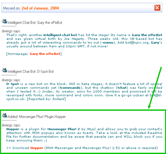 Shoutbox » MsgHelp Archive » Messenger Plus! for Live Messenger » Scripting » Plug-Ins » Hopper...let's Hop! (3.04.0275: Updates available!)