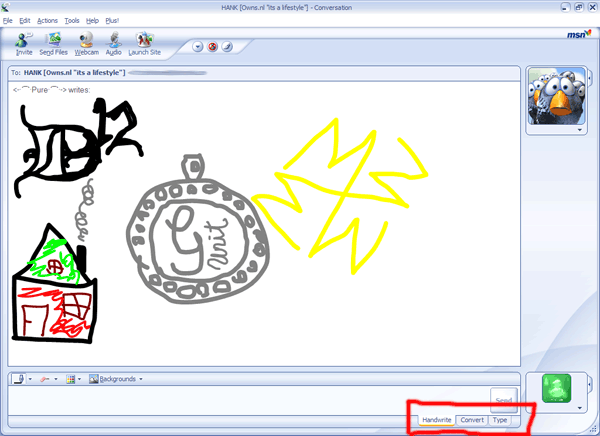 MSN Messenger 6 is all about "expressing yourself" and from now on you can also send just about anything you draw with your mouse directly as an instant message -so-called "ink message"- to your contacts! ... Your contacts don't need this software installed to receive the images...