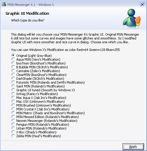 MSN Messenger - Windows X Edition was released today holding a build number of 4.1.0207 . It includes 21 themes (plus original theme) for MSN Messenger, enables polygamy (multi-msn), and removes ads.