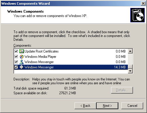 OK well here's another problem that would cause a problem i have service pack 1 installed yet windows messenger does not apear in the add remove options and ive tried a few other options and they just won't work. Its almost as if windows doesn't know windows messenger is on my machine. The traces of it are so minimal. Like I said the only way i know its running is through the 8mb or ram its sucking up when i look at it in my task manager or also when i first log in i get the message you have been signed in at another location. It gets irritating when im running msn messenger 6.1 and don't want windows messenger bothering me. So yes I did look on google and found no help I was wondering if someone had ran into similar problems.