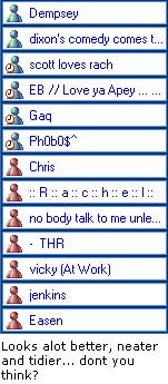 #3, also bein able to have them listed by status would be good for people with quite alot of floating contacts... as far as the impossibility is concerned... it could be ruled off so that when the option "dock all contacts in a row" is selected... patchou could create a function to define wether they are all docked or not... if they are then each object would have an Index... simply looping them and re-arranging them in order of status could be done...