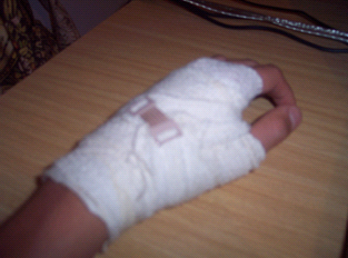But now my hand is bandadged and it really hurts...to top it all off, its my writing hand that got hurt, so now i can't do my homework unless i type it all :dodgy: