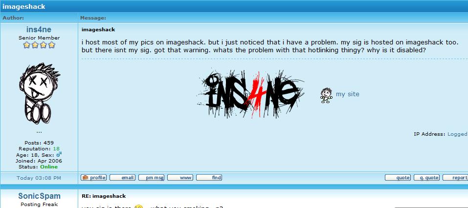 i host most of my pics on imageshack. but i just noticed that i have a problem. my sig is hosted on imageshack too. but there isnt my sig. got that warning. whats the problem with that hotlinking thingy? why is it disabled?