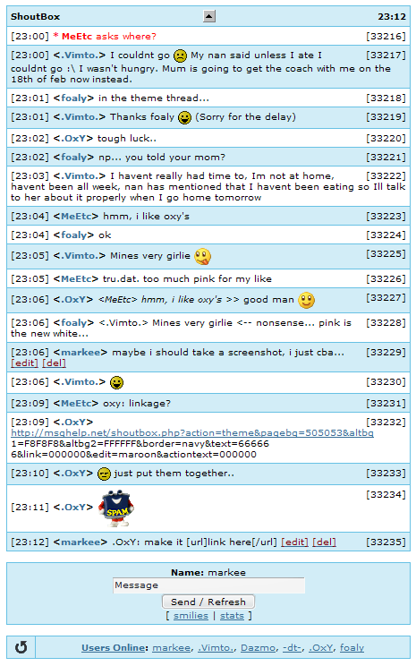 This is a thread dedicated to the shoutbox themes. Basically, if you have a theme other than the default one, show a screenie and give us the code!