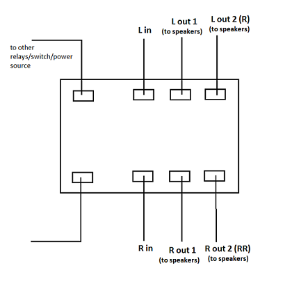 You'd have a circuit with a DC battery (voltage depandant on what relays you end up choosing) running through the relays and a switch inline. As for the relays, you simply wire up the two possible inputs and outputs. Here's a sample relay wiring diagram on a single DPDT for just the L and R inputs of your PC: