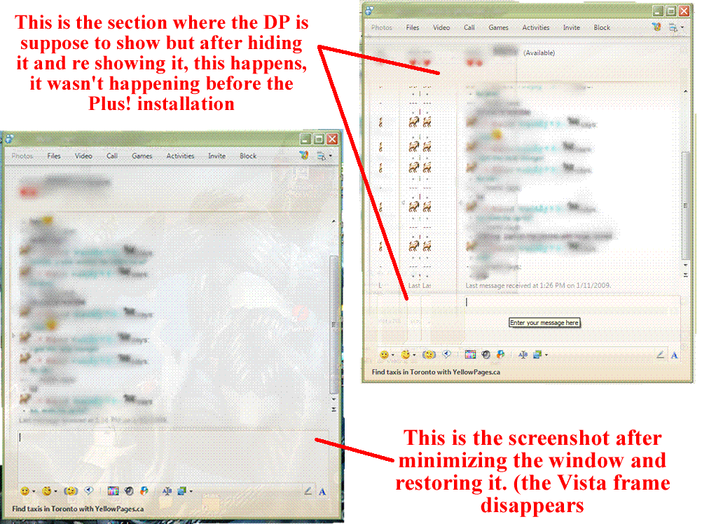 Here is are the screenshots of the main window (never has vista window frame), the chat window after hiding the DP's, and the chat window after minimizing (the Vista window frame disappears