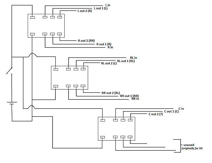 I'm pretty sure that diagram is correct if your inputs are on the bottom. Not sure if it'd work in both directions. I'm assuming that when you're in your PC position the plan is to simply turn off the centre channel. Also: save yourself some connections and don't bother running the sub through the relay.