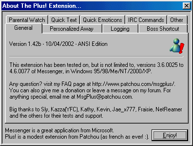 i've been using messenger plus! from the very beginning (though i only joined the forums last month) and I LOVE IT!!! and i always will. but i stopped using it for a while when i had msn 6 and it wasn't compatible with it, so during that time i was hoping that Patchou would pull it through so i could have both msn 6 and messenge plus!, and he did!