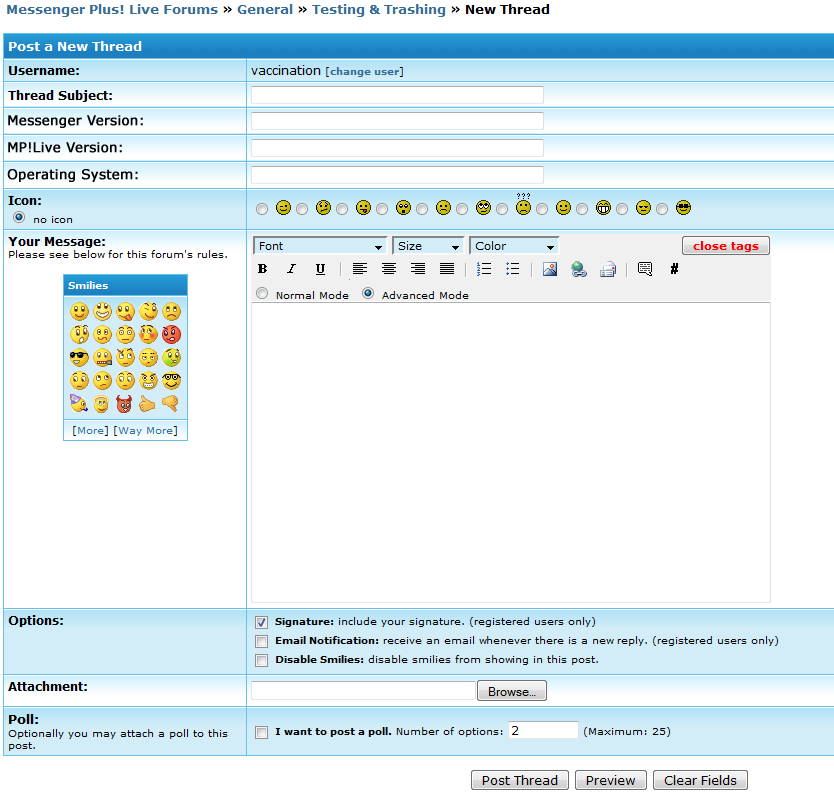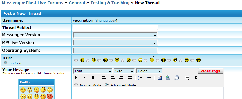 instead of insisting on adding text people won't read anyway, why not create a special "New Thread" form when people post in the help/bug sections? they would be required to select things like Messenger version, Windows version, etc... in addition to their bug description, how to reproduce it, etc... would that be possible?