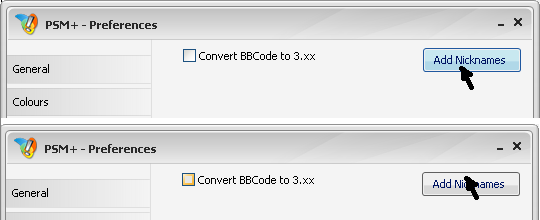 As for the error you mention. I'm not quit sure as to what you mean. When I click anywhere around the "Add Nicknames" button it does nothing. When I click the button it works and when I click "Convert code..." it turns the option on or off. I see no bug and nobody else has reported it...