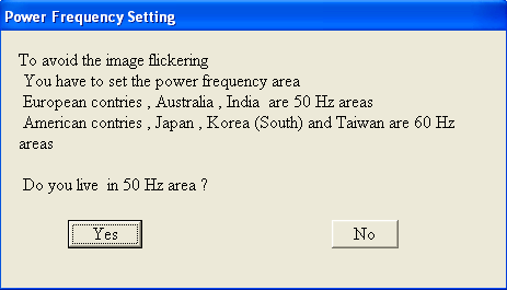 That Times new Roman font is dodgy-looking for a windows popup...anyway, choose the right option..if you live in Europe australia or india choose 50Hz...if you live in the american continent, on Japan, South Korea or Taiwan choose No, and another dialog should appear asking if you live in a 60Hz area..