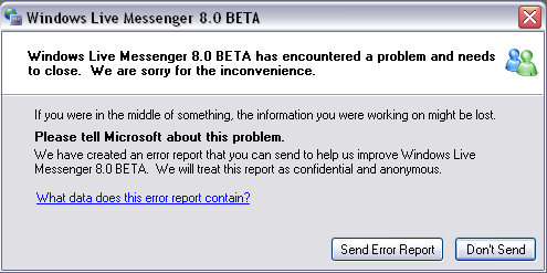Whenever i start WLM 8.0 Beta and press Sign In, a Windows error message prompts saying, "Windows Live Messenger 8.0 BETA has encountered a problem and needs to close. We are sorry for the inconvenience.", with the options Send and Dont Send.