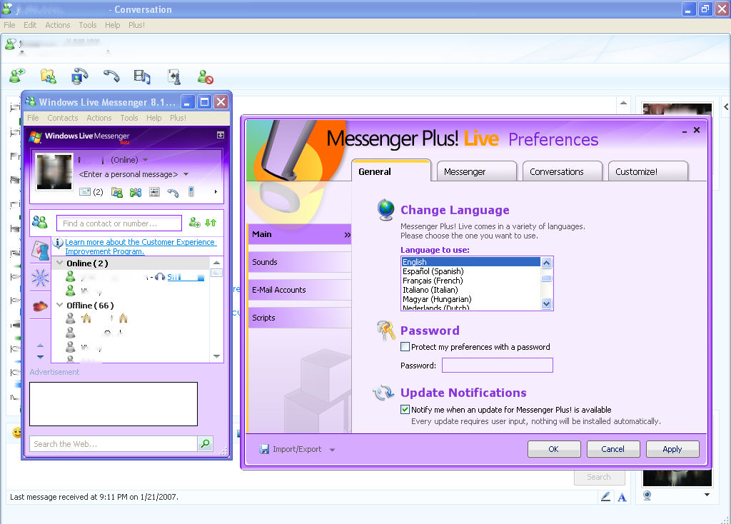 More of an annoyance than anything, but I remember changing a color choice to purple at some point (don't ask why). I remember thinking at the time I was changing the text color, but it ended up changing the color of the contact pop-up window as well as the background (skin color) on the main messenger window and the background of the main plus window. (the chat windows are fine)