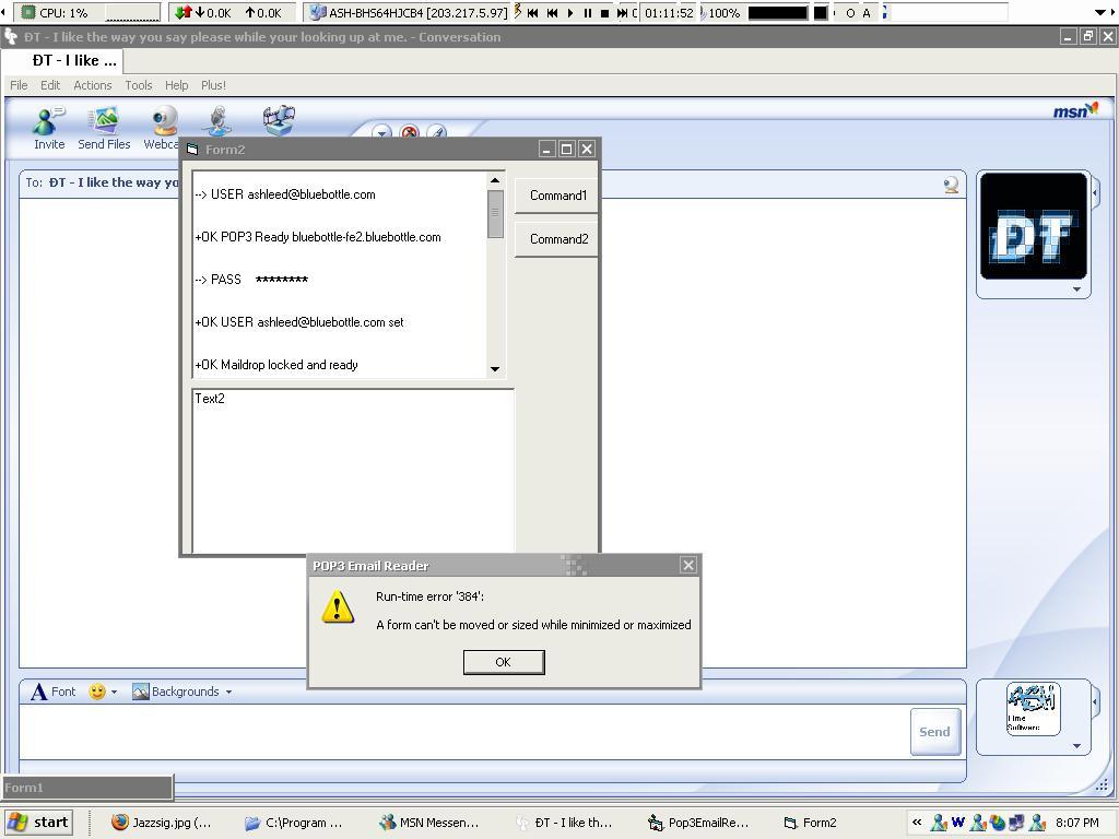 im making a plugin atm, ive got the dll call the main exe with args afterwarsds like "C:/Ash.exe -Cool,Hi" and stuff, but when i call the main exe a little box at the bottom left corner comes up like the bar at the top of IE or Firefox which says the title of the page and stuff, but the form says "Form1". i dont have a form one in my dll, or my main exe, or even my config exe. when i dont click on it i get this error when loading my form in the main exe "Error 384 : a form cant be moved or sized while minimized or maximised." ive run this program by itself not called form the dll and it works perfectly, ive called it from command prompt with the extra args and it works fine. also if i double click on the title bar that says form1 it goes away and my program loads corretctly. but if i leave it there i get error 384. ill upload a screenshot for yas. Also the plugin is gonna be that POP3 Email Reader which brings it up in a little box like the MSN boxes, all of version 1.0 is coded just this little error. Thanks in advance for all your help.