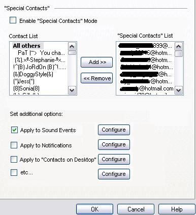 So in conclusion, and i know i am a bit off topic, but selecting and having some of your contacts labeled "special"(or another term) can make many features easier, expand the plus features and its limits, and give some of your contacts "special" or priveledged rights. this feature may be significantly hard to impliment, but it can go a long ways, and i have just begun. patchou, or many other avid fourm writers could expand on this feature, and make it a huge success of a major new version of plus. I hope my idea was helpful, and maybe if not used, it could spring another similar idea! thanks for your time reading, below is a SAMPLE preferences window for "special contacts", for what i was trying to explain above. this might give some people a better idea of what i mean. this window would simiarily resemble the "Filtered contacts" window in msgplus used for filtering contacts that the auto accept feature works for. it can be found under Plus>Preferences>Instant Messages>General Options>[Filter Contacts] (button).