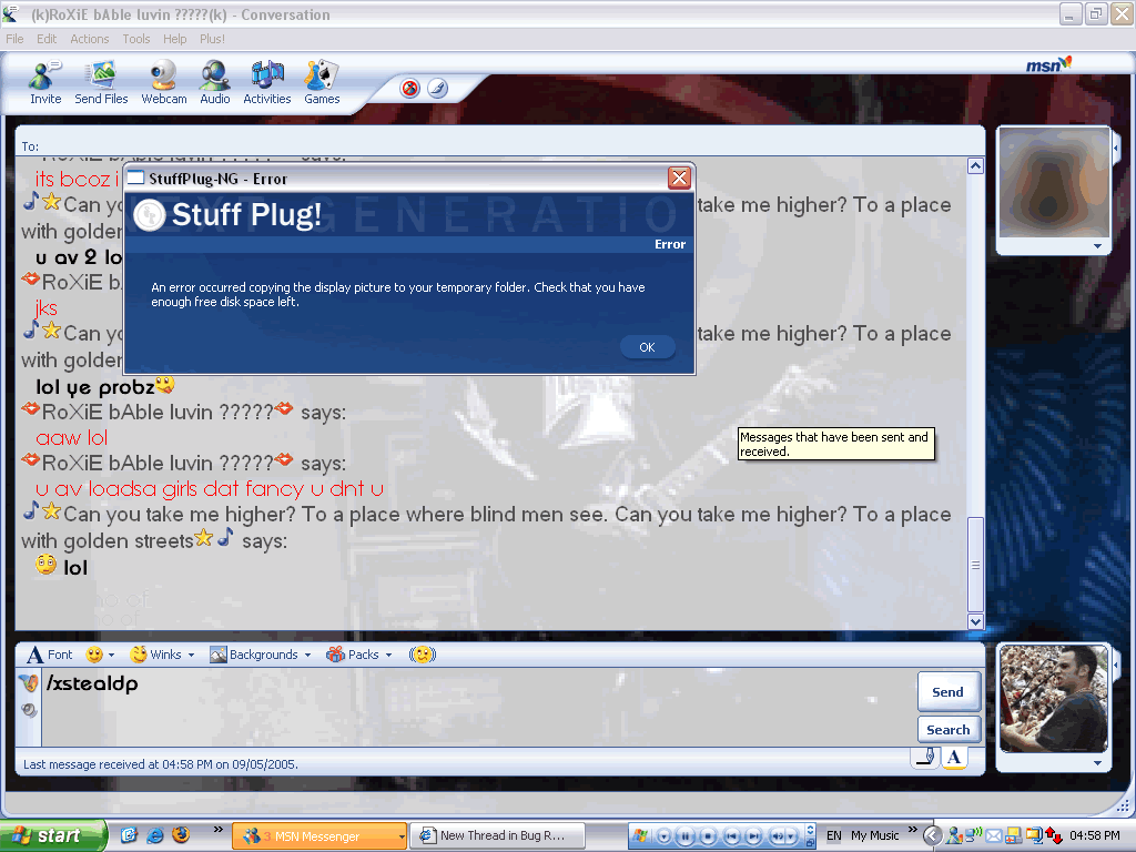 I seem to be having a problem with the Steal Display Picture feature in StuffPlug NG. When I click 'Plus! > Plugins >StuffPlug-NG > Steal Display Picture' I get an error pop up as shown bellow. I have lodes of room on my Hard Drive (94.9 GB out of 127 GB) so I don't know what the problem is