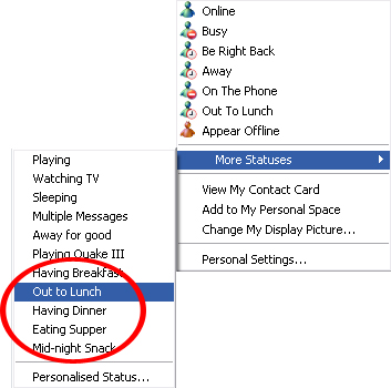 BTW Supersonicdarky.....its very stupid to have a Out To Lunch MSN Messenger status and a Out To Lunch Custom Status.....I see no point to it....The only is a auto-reply message but thats it.