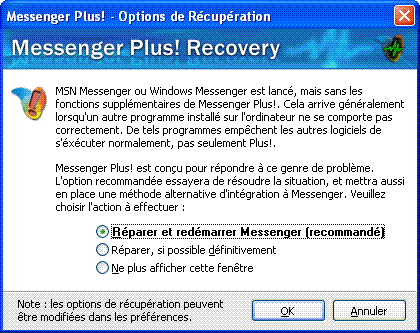 - Plus > preferences > miscellaneous..under Messenger Plus! Automatic Recovery Options, set it to "Alternate".