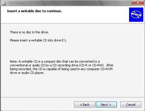 well im guessing that means, either there's no disc in the drive,or you need to set it where to look at correctly, or you're not putting a correct type of disc in...?