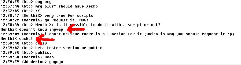 What the newbie is trying to say is that there should be a function /echo in Plus!, similar to that in mIRC so that you can test stuff, which only you would be able to see
