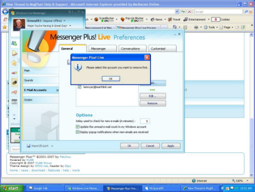 I'm trying to remove an email account from Messenger Plus! Live. When I go to Preferences-->Email Accounts, I put a checkmark by the Account I want to Remove then click REMOVE but I get a "Please select the Account you want to remove first" message. I tried it with the Edit button too and get that same message. I've attached a screenshot.