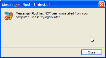 However, when I tried to unistall it via "Add/Remove Programs", I get the message "Messenger Plus! has NOT been uninstalled from your computer. Please try again later." I made sure no other apps were running, I've rebooted, but still nothing.
